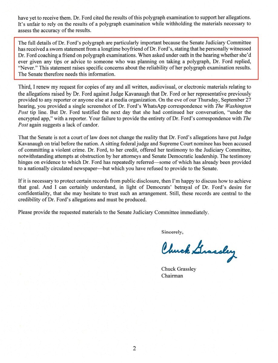 Кажется, агентам ФБР или коммитетчикам Cената нужно бы позадавать вопросы мисс МкЛин и этомоу джентельмену под страхом уголовного наказания за нарушение 18 USC 1001. Собственно, копию этого письма с припиской о согласии с уголовной ответственностью за дачу заведомо ложных показаний коммитету Сената – уже получили сотрудники мистера Грассли. А там – глядишь – может и появится резон взять мадам Форд за мягкое место. Запрос адвокатам Форд на предоставление документов по полиграфу – уже ушел, они что-то невразумительное отвечают, типа дадим, когда будем говорить с ФБРовцами...